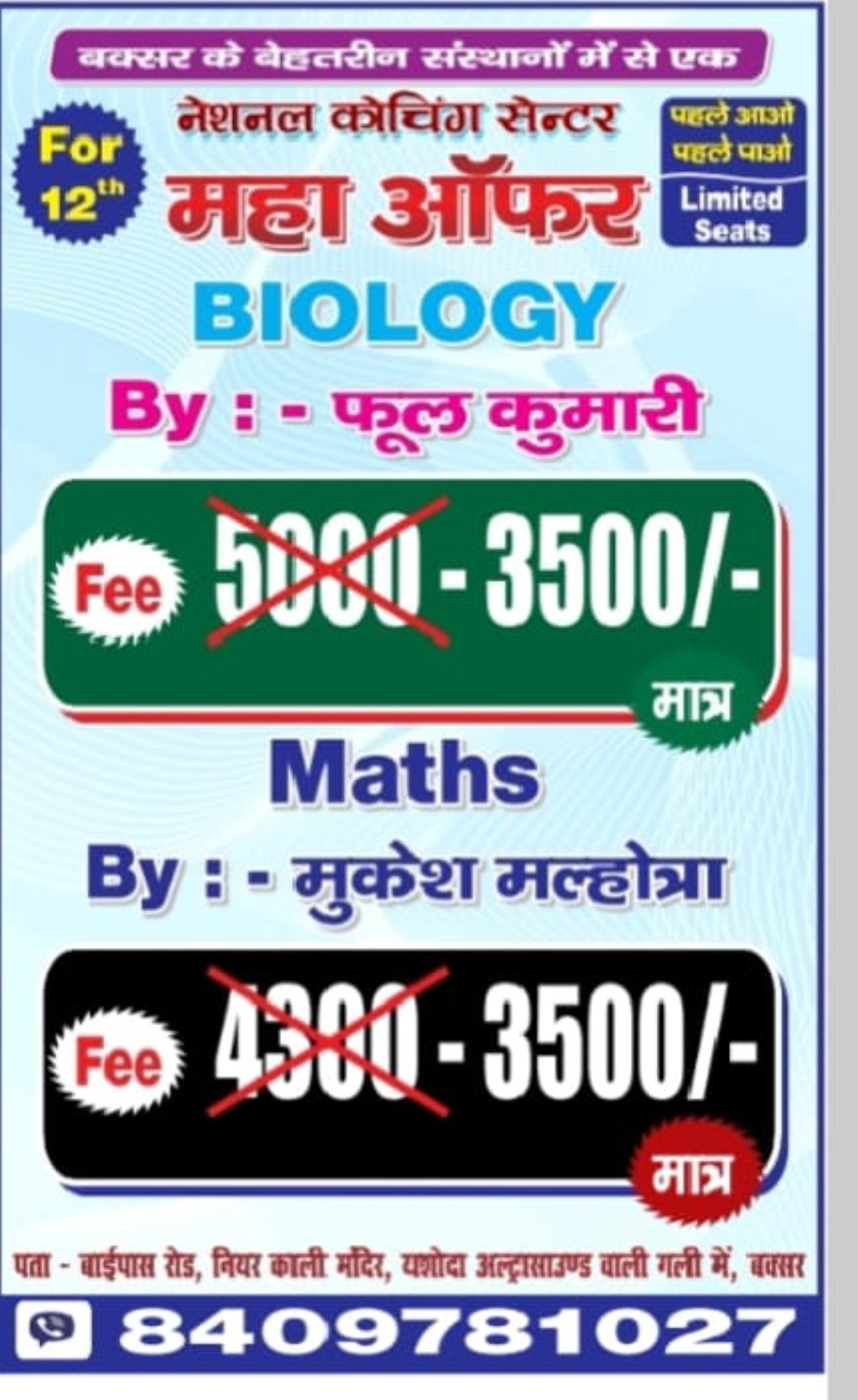 बीआरएन बक्सर। जिले के प्रतिष्ठित शैक्षणिक संस्थानों में शामिल नेशनल कोचिंग सेंटर एक बार फिर छात्रों के लिए सुनहरा अवसर लेकर आया है। बाईपास रोड, काली मंदिर के समीप, यशोदा अल्ट्रासाउंड वाली गली में स्थित इस संस्थान ने शैक्षणिक सत्र 2026-27 को ध्यान में रखते हुए “पहले आओ, पहले पाओ” के आधार पर महा ऑफर की घोषणा की है। सीमित सीटों के साथ शुरू किए गए इस विशेष ऑफर को लेकर छात्र-छात्राओं में खासा उत्साह देखा जा रहा है।