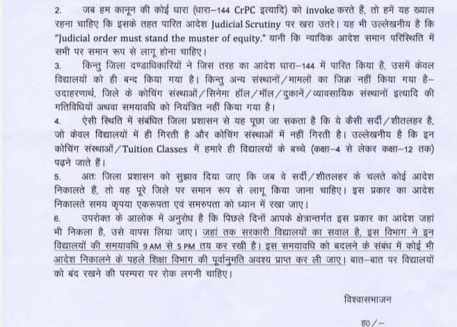 केके पाठक ने पत्र में कहा है कि जिला पदाधिकारियों ने जिस तरह का आदेश धारा-144 में पारित किया है, उसमें केवल विद्यालयों को ही बन्द किया गया है, लेकिन अन्य संस्थानों का जिक्र नहीं किया गया है। जैसे कि जिले के कोचिंग संस्थाओं, सिनेमा हॉल, मॉल, दुकानें, व्यावसायिक संस्थानों की गतिविधियों या समयावधि को नियंत्रित नहीं किया गया है।