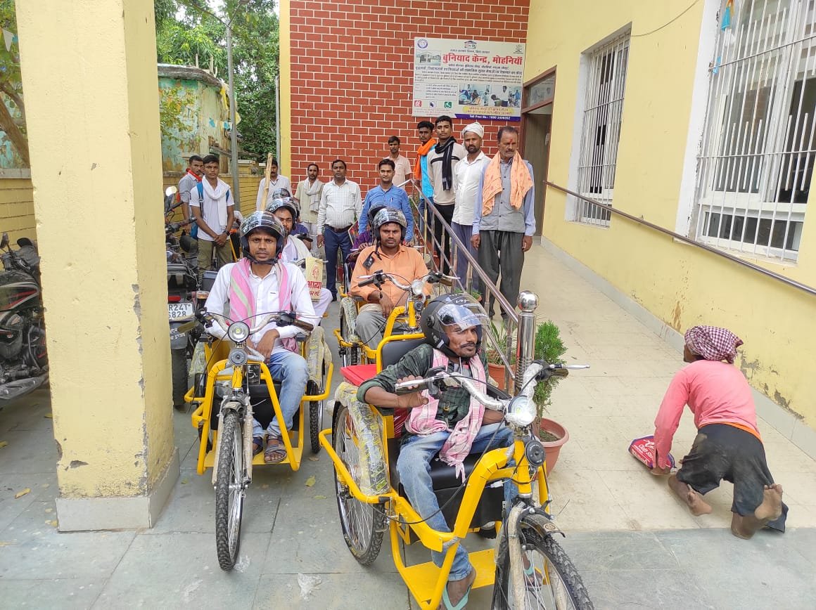 राजीव कुमार पाण्डेय मोहनियां।मुख्यमंत्री दिव्यांगजन सशक्तीकरण छत्र योजना के तहत संबल योजना के अंतर्गत शुक्रवार को 14 दिव्यांग जनों को बुनियाद केंद्र परिसर में बैटरी चालित ट्राई साईकिल का वितरण किया गया।साथ ही उन्हें सहायक निदेशक सामाजिक सुरक्षा कोषांग सह दिव्यांगजन सशक्तीकरण अतुल कुमारी द्वारा हरी झंडी दिखाकर रवाना किया गया।
